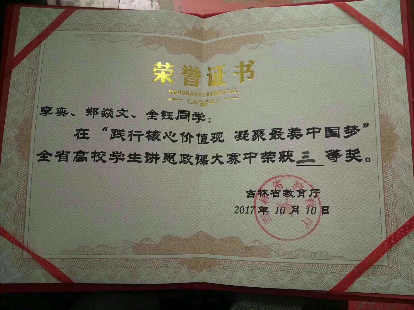 学院新闻 我校学生代表队在全省首届大学生讲思政课大赛中荣获三等奖 作者:浏览:时间:2017-10-31 10月9日,“践行核心价值观 凝聚最美中国梦”全省高校学生讲思政课大赛决赛在长春理工大学举行。我校yl6809永利官网集团推荐的学生代表队(负责人、主讲:李奕,成员:金钰、郑焱文;指导教师:陈卫、董艳梅)在本次大赛中荣获三等奖。 本次大赛由吉林省教育厅高校思想政治工作处、高等教育处联合主办,旨在深入贯彻落实全国和全省高校思想政治工作会议精神,扎实推进高校思政课教学质量年专项工作,着力提升思政课教学的亲和力和针对性,切实增强学生对思政课的参与度和获得感。